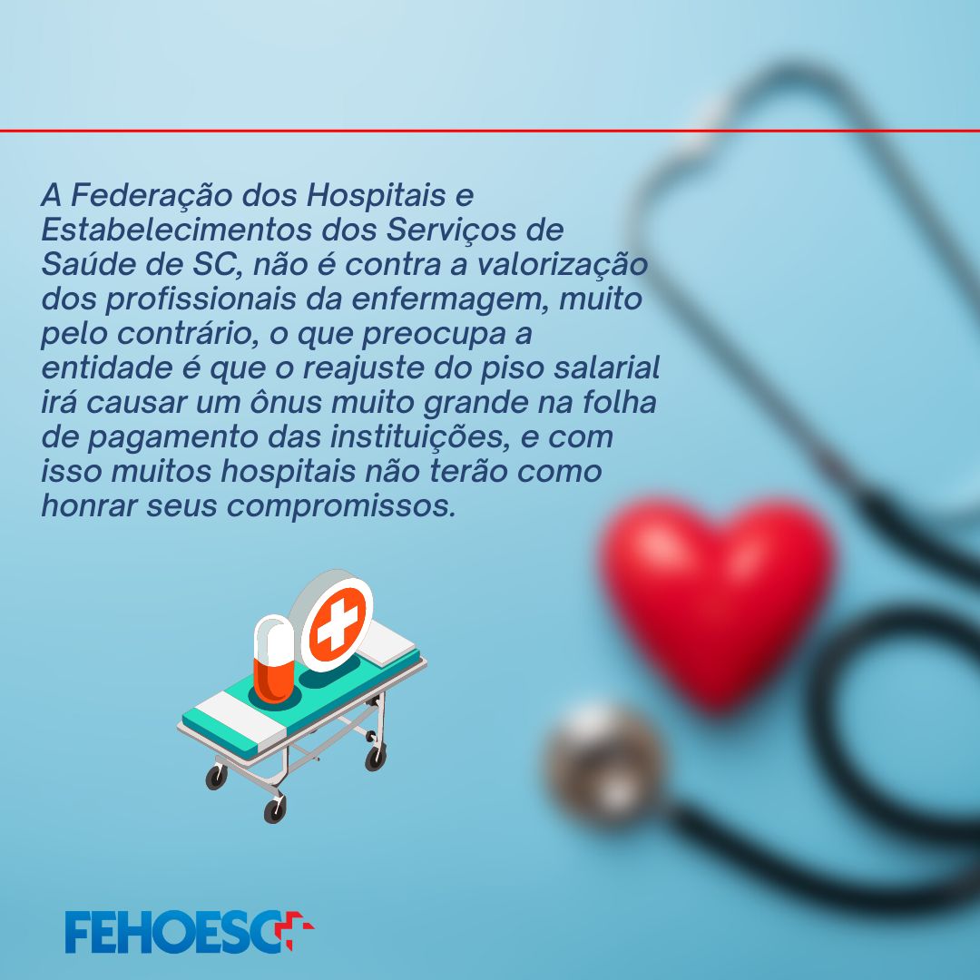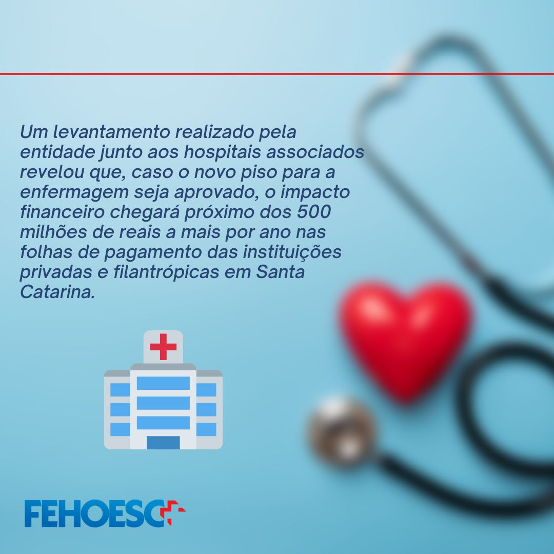 A Fehoesc demonstra preocupação sobre a tramitação do PL 2564/2020, que está em regime de urgência na Câmara e trata sobre o piso nacional para a enfermagem. O impacto em SC chega perto dos R$ 500 milhões. A entidade defende que é preciso viabilizar a fonte de recursos, que subsidiará o piso. Em todo país o impacto previsto é de 16 bilhões de reais.