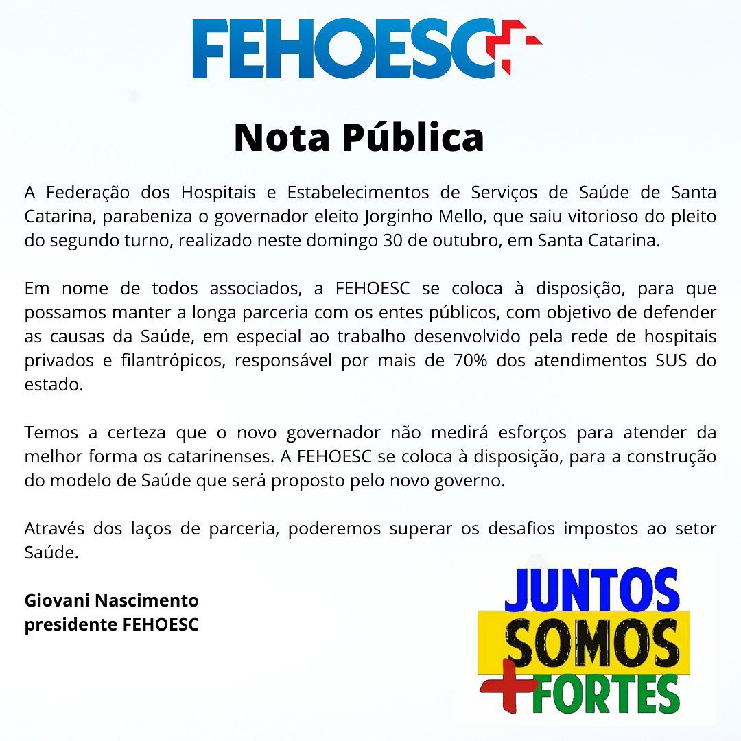 Nota Pública FEHOESC Eduardo Silva2022-10-31T10:22:38+00:00 Compartilhe nas Redes Sociais facebooktwitterwhatsappE-mail Postagens Relacionadas FEHOESC participa de reunião com o Ministério da Saúde sobre o Programa Agora Tem Especialistas Galeria FEHOESC participa de reunião com o Ministério da Saúde sobre o Programa Agora Tem Especialistas 04/12/2025 | 0 Comentários FEHOESC participa de Seminário sobre Saúde Mental dos Trabalhadores do setor em Santa Catarina Galeria FEHOESC participa de Seminário sobre Saúde Mental dos Trabalhadores do setor em Santa Catarina 01/12/2025 | 0 Comentários 45º Encontro Catarinense de Hospitais chega ao fim destacando tendências para a gestão no setor Galeria 45º Encontro Catarinense de Hospitais chega ao fim destacando tendências para a gestão no setor 27/11/2025 | 0 Comentários