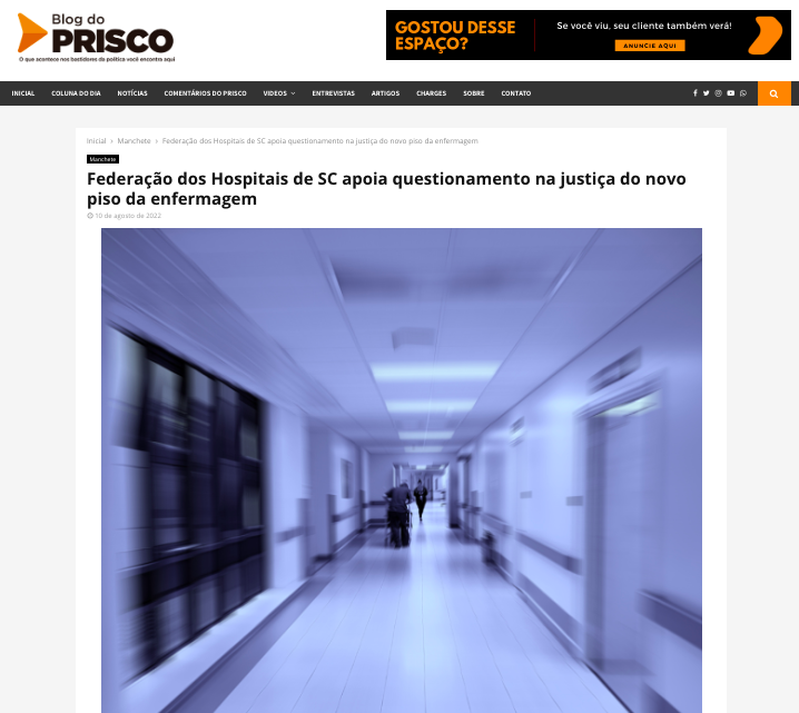 Eduardo Silva2022-08-11T12:04:12+00:00BLOG DO PRISCO: Federação dos Hospitais de SC apoia questionamento na justiça do novo piso da enfermagem Confira: https://www.blogdoprisco.com.br/federacao-dos-hospitais-de-sc-apoia-questionamento-na-justica-do-novo-piso-da-enfermagem/