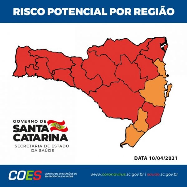 A Matriz de Risco Potencial divulgada no último fim de semana pelo Governo de Santa Catarina e Secretaria de Estado da Saúde (SES) classifica 12 das 16 regiões em alerta gravíssimo (cor vermelha) e quatro em risco grave (cor laranja) para transmissão do novo coronavírus.
