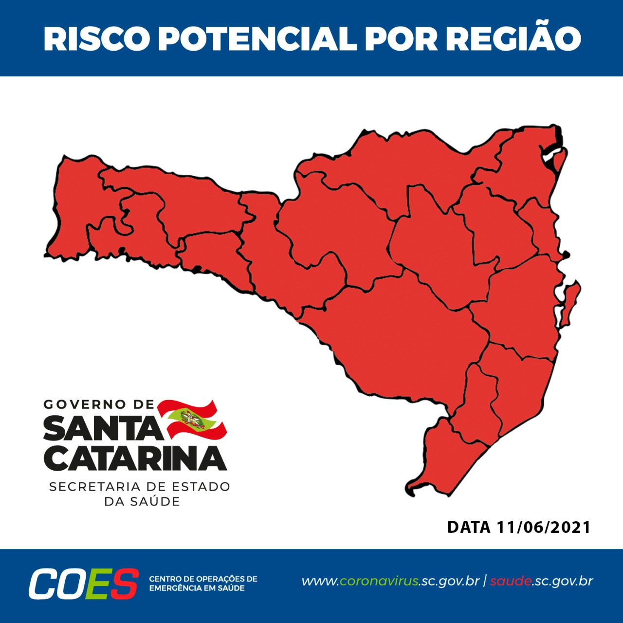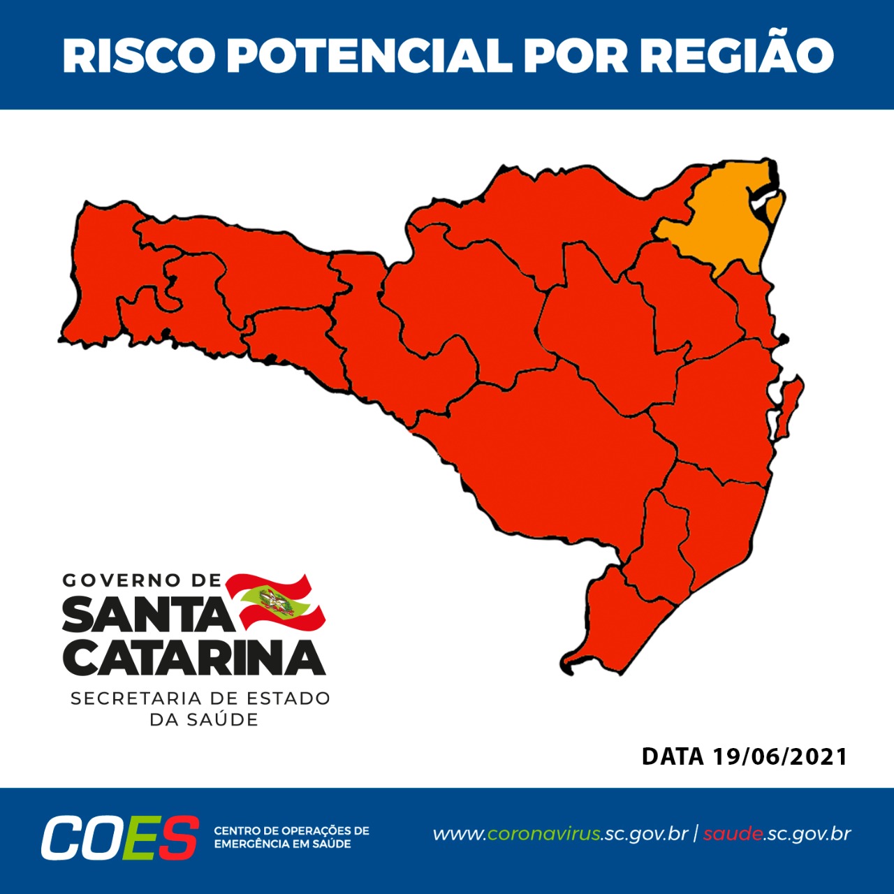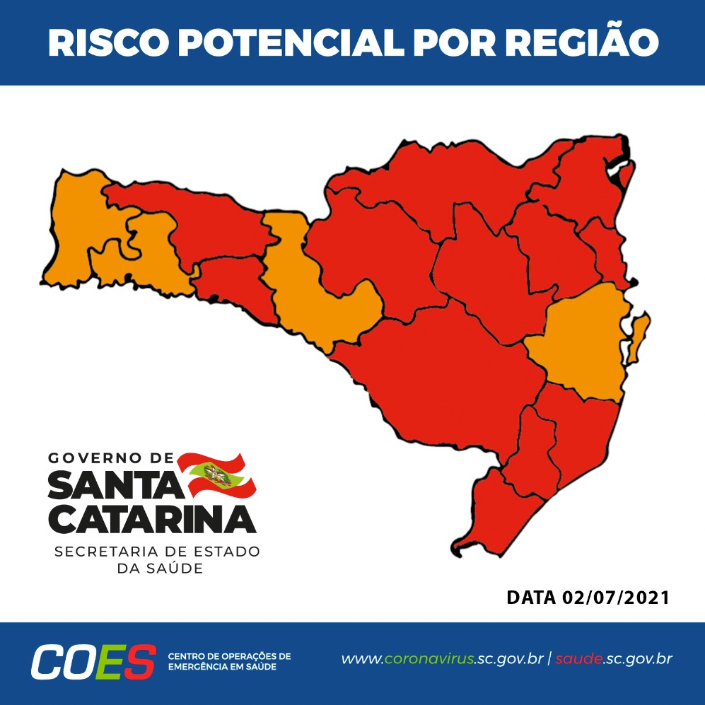 Eduardo Silva2021-07-11T23:00:42+00:00A Matriz de Risco Potencial para a Covid-19 divulgada pelo Governo de Santa Catarina e Secretaria de Estado da Saúde (SES), neste sábado, 10, segue apontando melhoras nos índices. O mapa desta semana aponta oito regiões em estado Grave (cor laranja) e outras oito em nível Gravíssimo (cor vermelha). As regiões do Alto Uruguai Catarinense, [...]