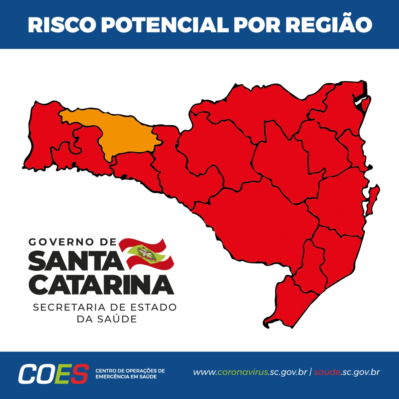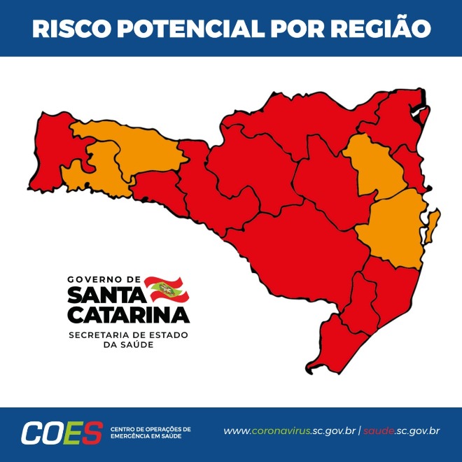 Eduardo Silva2021-08-26T15:33:05+00:00A Matriz de Risco Potencial divulgada nesta quarta-feira, 30, pelo Governo de Santa Catarina e Secretaria de Estado da Saúde classifica 12 das 16 regiões de saúde do estado como em alerta gravíssimo (cor vermelha). As regiões de Xanxerê, Oeste, Médio Vale do Itajaí e Grande Florianópolis obtiveram avanços e foram reclassificadas para o nível [...]